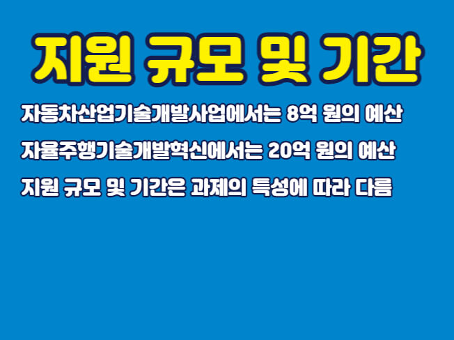 2023년도 예산에 따른 연구개발 비 지원 규모 및 기간은 다음과 같습니다. 자동차산업기술개발사업에서는 8억 원의 예산으로 1개의 과제를 지원하며, 자율주행기술개발혁신에서는 20억 원의 예산으로 1개의 과제를 지원합니다. 각 연구개발 과제별 지원 규모 및 기간은 과제의 특성에 따라 다르며, 상세부적으로는 첨부된 RFP(요청서)를 참조하시면 됩니다.
