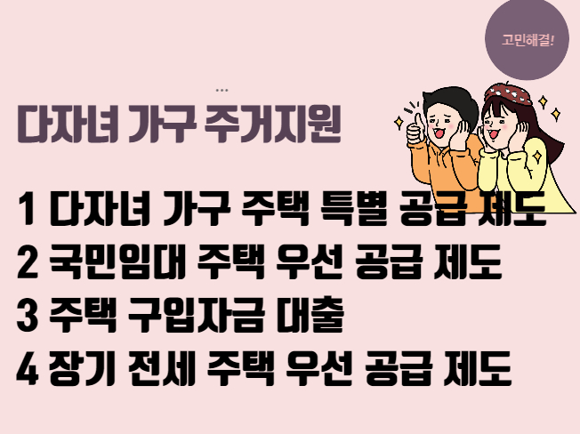 | 국민임대 주택 우선 공급 제도 | 전년도 가구원수별 가구당 소득이 월평균 소득 50% 이하인 경우, 미성년 자녀 2명 이상 가구가 신청할 수 있음 |