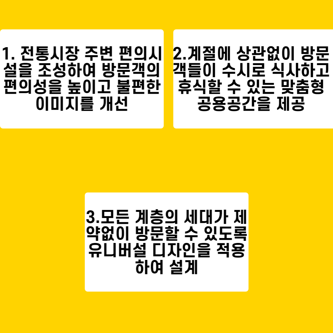 - 계절에 관계없이 쾌적한 분위기에서 시장 음식을 즐기고 휴식을 취할 수 있는 공용공간 조성을 통한 접근성 제고
