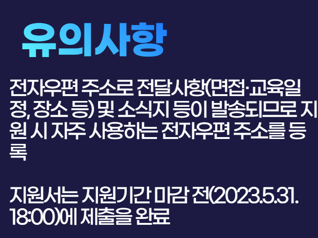 지원 시에는 자주 사용하는 전자우편 주소를 등록하셔야 합니다. 등록된 전자우편 주소로 전달사항(면접·교육일정, 장소 등) 및 소식지 등이 발송되기 때문입니다.