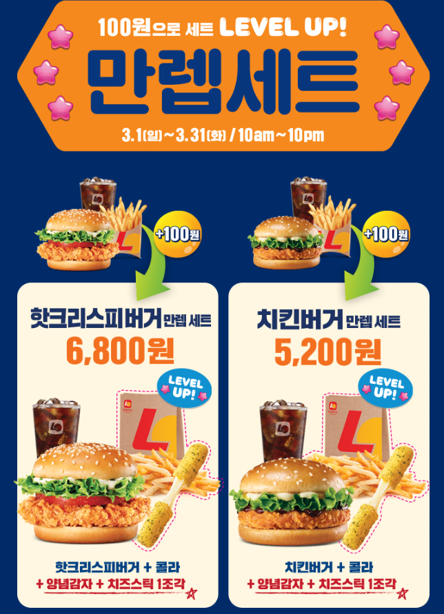 3월 1일 ~ 3월 31일 오전 10:00 ~ 오후 10:00 까지 핫크리스피버거, 치킨버거 세트를