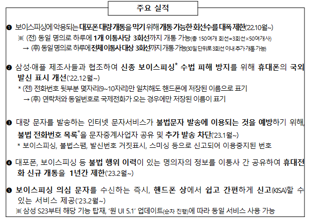 과기정통부는 '보이스피싱 통신분야 대책'을 마련한 뒤 이통사와 제조사와 협력하여 보이스피싱 피해 예방을 위한 기술적·제도적 조치를 추진하고 있습니다. 이번 신규 서비스는 이 대책의 후속조치로 기획되었으며, 보이스피싱 조직이 해외 콜센터를 악용하는 범죄를 예방하기 위한 것입니다.